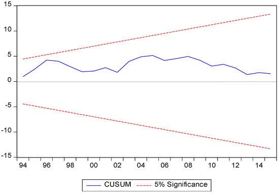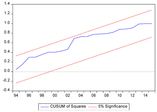 The outcomes of the diagnostic tests are presented in Table 8. The normality test results showed that the p-value exceeded the 5% significance level, and it provides evidence that the model of this article is normally distributed. Furthermore, the results of the LM test indicate that there is no autocorrelation in the tested model, and this model is homoscedastic. Furthermore, the Ramsey–Reset test results suggest that the model is well specified. Figure 3 and Figure 4 show the CUSUM and CUSUM of squares (CUSUMSQ) charts. The CUSUM chart suggests that the model in this article is not mis-specified, and the CUSUM of squares shows that there was no structural change in the model over the investigated period.