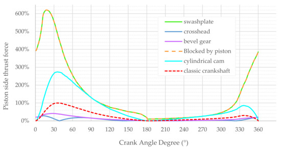 Figure 3. The maximum force in the classic crank mechanism (red dashed line) was taken as the reference value (100%). Significantly, in some mechanisms this force can be much greater (swashplate, cam mechanism, wobble plate blocked by piston). This may be the reason for the popular belief that axial engines are not worth considering because of their low efficiency. It should be noted, however, that there are mechanisms that are very competitive with the classical construction. These are mainly designs based on bevel gears or crosshead. The lateral piston force can be as much as 50% lower here than in a conventional engine. This is one of the reasons why these two types of engines were selected for use in the actual test prototypes.
