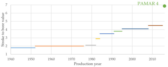 16], the parameter value for Sulzer marine engines in the late 1970s was around 2 (RLB engine) and has doubled by the early 1990s, continuously growing (Wartsila X35-4.43). The change in this parameter over the years is presented in