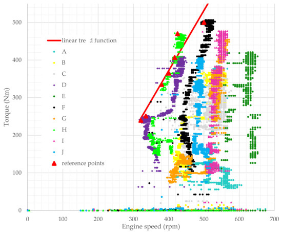 Figure 11 shows the results of the engine tests for the different experiment series. Each point shows specific parameters of rotational speed and torque at which the engine has worked. Bigger red dots in the figure represent several distinctive experimental points achieved at a stable operating condition of the engine that are characterized by a minimum rotational speed and maximum torque. On the basis of selected reference points, a linear trend function was determined and plotted as the red line in the