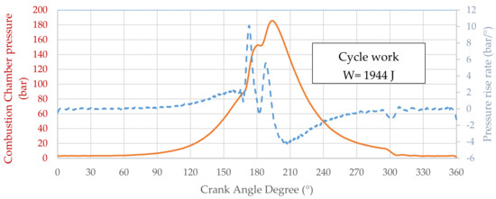 Figure 12. It is a diagram for the F test series, where the torque of 500 Nm was achieved. The maximum pressure in the cylinder is 185 bar, and the cycle work is 1944 J.