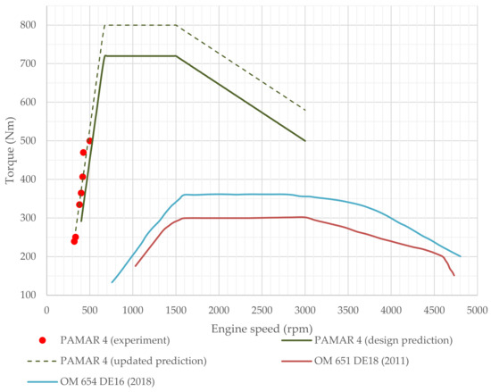 Figure 11. On their basis, the updated torque curve was determined, which is shifted by about 80 Nm compared to the design prediction. At the design stage, assumptions were made regarding some key parameters, which allowed to estimate the maximum torque expected in the PAMAR 4 engine. The maximum allowed pressure in the combustion chamber was assumed to be 300 bar. The preliminary assumptions included the maximum compression ratio of 1:20, the maximum absolute boost pressure of 4.5 bar provided by both the supercharger and turbocharger. Constant volume heat addition pressure ratio was estimated to be around 3, and the maximal pressure was expected to appear 5° before TDC. The heat flux lost from the combustion chamber has been limited by the special design of the piston, allowing the maximum temperature at its crown at 700 °C and for the combustion chamber walls at 600 °C. Basing on these parameters (solid green line on the graph), the stable operation of the engine was to be achieved at a speed of about 400 rpm and reached the nominal value of 720 Nm at 800 rpm. The experiment has shown that these expectations can be raised, as shown by the dashed green line in the figure. The torque of 240 Nm was successfully achieved at the rotational speed of around 300 rpm, which provides powerful evidence for the engine’s downspeeding capability. Taking into account the maximum torque of 500 Nm obtained during the experiment with as much as 180 bar, it was found that with a very high probability the result of 800 Nm can be achieved without exceeding the maximum allowable pressure in the cylinder.