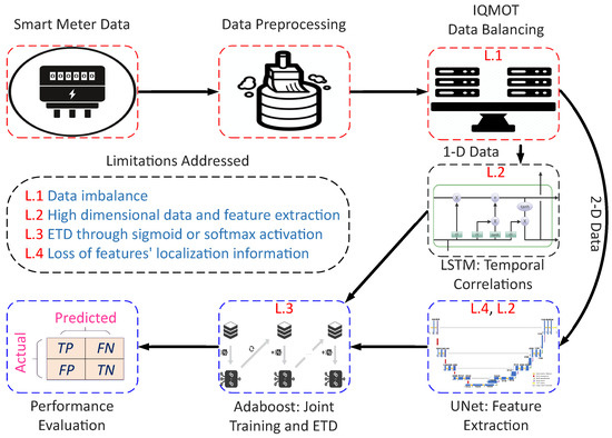 - In this work, a combined LSTM–UNet–Adaboost model and a novel class balancing mechanism IQMOT are proposed for ETD in the smart grid environment. IQMOT is introduced to solve the data imbalance concerns faced by the traditional models.