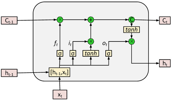 LSTM is a special class of RNN, which has the capability to retain and propagate information from the initial stage towards the final stage of the model [48]. Figure 4 displays the general structure of the LSTM model. It has three important gates, known as input gate , output gate and forget gate . Its main component is the cell state, which maintains the long-term dependencies along the chain. Thus, the dependencies in the cell state are managed by the aforementioned gates. In Figure 4, and show the current and previous cell state, respectively. and show the outputs of the current and previous LSTM units, respectively. Furthermore, and represent the sigmoid and hyperbolic tangent functions, respectively. Both functions are non-linear activations in the LSTM model. and are the weights and biases of the LSTM model, respectively. LSTM is based on daily electricity consumption data to produce a single output, known as , which is also recognized as the hidden state at the last time step. Hence, LSTM achieves its purpose by processing the following Equations (4)–(9) [48]: