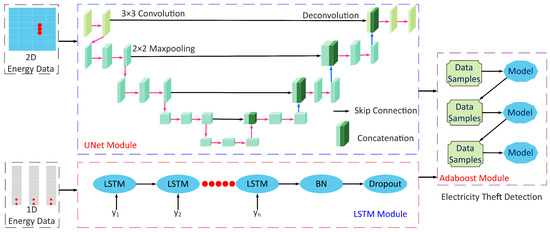 - To increase the model’s theft detection performance and stability, deep learning LSTM and UNet are combined with an ensemble learning Adaboost. Deep learning automates feature extraction from 1-D and 2-D electricity consumption data, whereas ensemble learning is used for joint training and classification. In this way, the LSTM–UNet–Adaboost model gains the benefits of most recent and powerful techniques of deep learning and ensemble learning.
