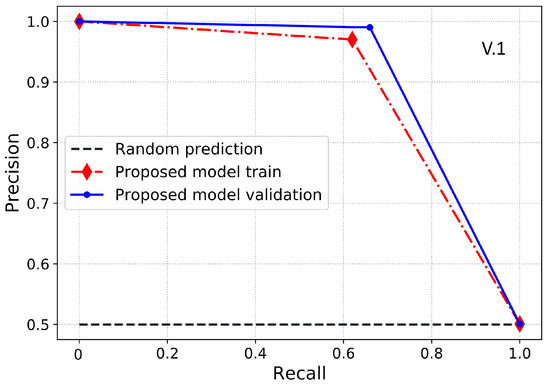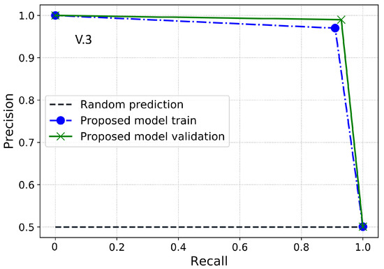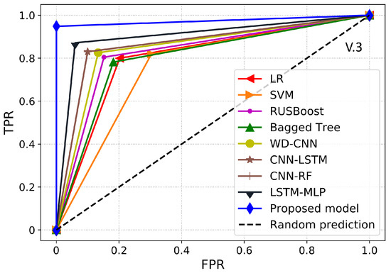 Figure 6 shows the ROC-AUC of our proposed LSTM–UNet–Adaboost model; the proposed model has achieved better ROC-AUC than other random predictions in terms of training and validation sets. Similarly to the ROC-AUC, our proposed model has also covered more PR-AUC than any random predictions using IQMOT, as shown in Figure 7. It is worth noting that our proposed scheme has covered more areas over the training and validation sets in terms of ROC-AUC and PR-AUC, which shows the superiority of our proposed scheme. Furthermore, Figure 8 shows the ROC-AUC comparison with existing benchmark models. It is evident that the proposed model has the highest ROC-AUC score and covers more area under the ROC curve. As mentioned earlier, the main goal is to maximize the DR and minimize the FPR in ETD, which has been achieved by our model as compared to the existing models.