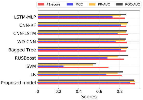 Similarly to ROC-AUC, the proposed model has also reported better results in terms of PR-AUC in comparison to other models, as shown in Figure 9. As we have already highlighted in Table 7, our proposed model achieved the highest PR-AUC score, higher than those of other benchmark models.