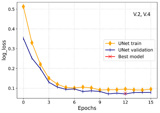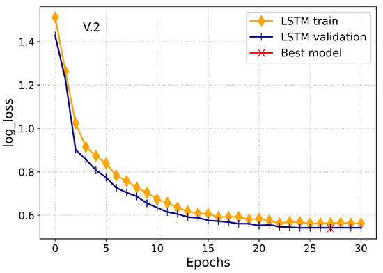 The simulations were done on the preprocessed data with a batch-size of 32. Epoch is a parameter that controls the model training. Figure 13 and Figure 14 illustrate the learning process of LSTM and UNet based on the training and validation loss to select the best configuration of a particular model. Figure 13 highlights the learning curve of LSTM in terms of logarithmic loss. In the first attempt, thirty training iterations were passed to the LSTM model; it shows the smooth learning process of the LSTM model and no overfitting happened until the 28th epoch. As we can see that at 28th iteration, the LSTM model performed best and reduced the training and validation loss to 0.67. It shows the gradual convergence of training and validation loss. Finally, the best model was selected at the 28th iteration, as shown in Figure 13, to train the LSTM model.