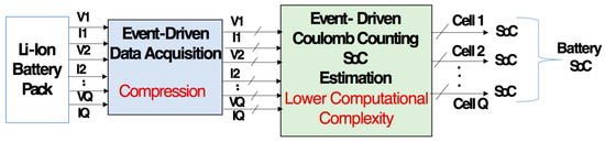 Hundreds of cells are used to form a single battery pack, and the state of each cell needs to be monitored [20,22,23], propelling the development of high-complexity BMSs with notable overhead battery power usage. This study contributes to enhancing the data processing chain of contemporary BMSs to effectively diminish the overhead consumption. This paper devises an efficient and moderate precision online SOC approximation method. It enhances the conventional coulomb counting based direct assessment method, applicable for online realizations required for electric vehicles and drones [24]. Additionally, it allows for simple and power-efficient realization, which is carried out by using the linear operations and functions [25]. The contribution of this work is to improve the computational effectiveness of the traditional coulomb counting approach, which is realized by intelligently incorporating the methodology of event-driven processing in the proposed solution. Event-driven analog to digital converters (EDADCs) effectively record the intended battery cell parameters, such as current and voltage. This significantly decreases the computational cost of the post SOC estimation process. This is realized through varying the sampling and processing rates by observing the incoming time-varying signal [12,16,17,22].