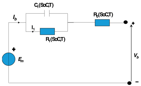 In this study, the employed dataset is generated by using the high-power Li-ion battery model presented in [18]. For reliable numerical modeling of batteries, equivalent circuit modeling (ECM) is a known technique [11]. As per [19], a single resistance-capacitance (RC) block is adequate to characterize all of the Li-ion cell’s dynamic properties. Therefore, in this work, a similar cell model is parametrized and used. Parameters are calculated by using the procedure described in [18]. The model elements are shown in Figure 2.