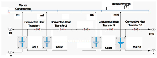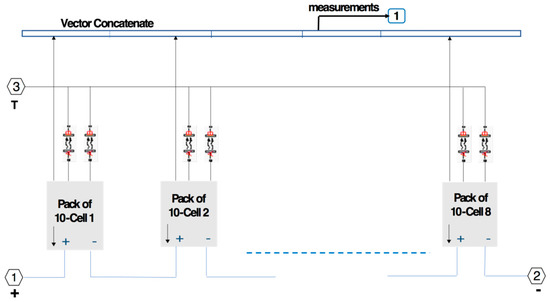 The use of EVs is evolving to address the aims of reducing global warming and greenhouse gas emissions. In this context, a case study is performed for a battery that is designed for use in EVs. Initially, a battery pack of 9.92 kWh rated capacity is modeled. This battery capacity is suitable for contemporary electric vehicles and can provide a range of 110 km while driving a Renault Twizy at a maximum speed of 45 km per hour in real life conditions [1,30]. The battery pack is first realized by assembling ten cells in series to form a cell pack of 1.24 kWh rated capacity. The process is illustrated in Figure 3. Afterward, 8 cell packs are combined in series to realize a battery pack of 9.92 kWh rated capacity. The process can be seen in Figure 4.