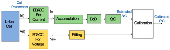 For the studied case, the state of charge estimation error of the suggested method is bounded by 4%. The integration of model-based or data-driven SOC estimation algorithms could improve the proposed system precision at an increased computational and implementation complexity. The system parameters, such as the resolution of EDADCs and the choice between uniform and logarithmic quantization schemes and online fitting methods, should be effectively adjusted in this framework in order to attain the best compromise between the system precision and computational cost.