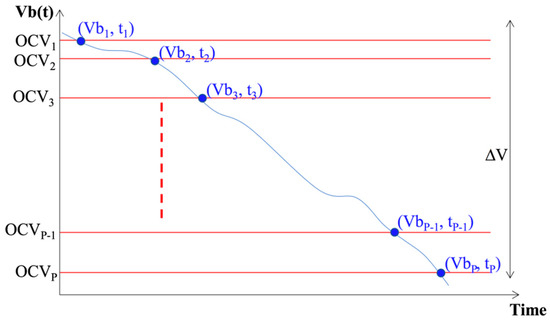 The calibration of estimated SOC is performed by using a reference SOC-OCV correlation curve, obtained by performing high precision experimentations in the laboratory [11,18,38]. Samples of this SOC-OCV curve are stored in memory as a lookup table. Equal length OCV and SOC sets are used, which are respectively OCV-V={OCV1, OCV2, …, OCVP} and SOC-V={SOC1, SOC2, …, SOCP}. The length of both sets is P.