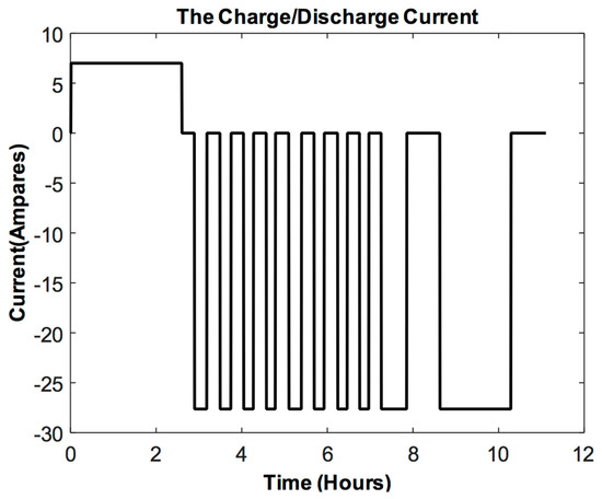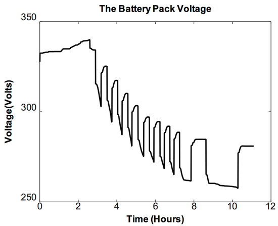A Li-ion battery pack model, consisting of 80 (LiNixMnyCozO2)-(NMC) chemistry-based cells, was used [27]. An impulsive charge/discharge current profile was used for the considered battery pack. This choice was made in compliance with the load profiles of electric vehicles [42]. In the beginning, a charge current was applied to mitigate any SOC loss due to internal losses and cell aging [30,43]. An impulsive profiled discharge current was then applied to progressively discharge the battery pack [20] (cf. Figure 8). Figure 9 shows the corresponding battery output voltage.