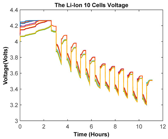 The battery cells were connected in series; therefore, similar charge/discharge current flowed through all of them. However, voltages across cells could be specific depending on their temperature and SOC [18,43]. The voltage curves of the first 10-cell pack are shown in Figure 10. These voltage curves can also be employed for the cell balancing of the battery pack [18,43]. However, in this study, these voltage curves are used for monitoring the SOC of each cell.
