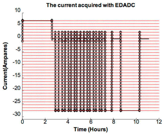 The current was acquired by employing a 5-bit resolution EDADC. It was composed of 32 discriminators and a 5-bit output priority encoder-based encoding logic [44]. The amplitude dynamics of the current-acquiring EDADC was chosen between (−28.1; 7.6) amperes. Therefore, a fixed value quantum, q = 1.12 ampere, was obtained. The output of the EDADC is shown in Figure 11. The EDADC gathers 700 current samples for the considered observation time of 11.11 h.
