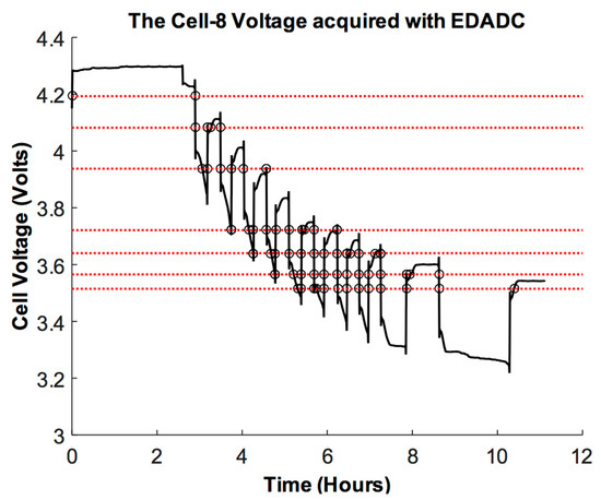 In compliance with the SOC-OCV lookup table, the voltage of each cell was sampled with a non-uniform EDADC, resulting in a varying quantum as a function of the used OCV-V. The process is presented in Section 2.3 using 2.8-bit resolution EDADCs. Each EDADC is composed of seven discriminators and a 3-bit priority encoder based output logic [39]. The EDADC output for cell-8 of the battery pack is shown in Figure 12. In this case, 73 voltage samples are acquired for the considered time period of 11.11 h.