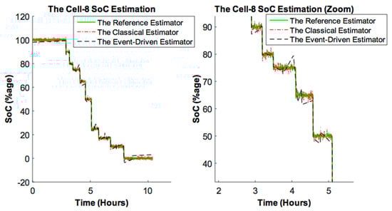 The SOC estimation error of the suggested approach is determined by following the process described in Section 2.4. In this study, the reference SOC estimator is based on 16-bit resolution ADCs. = 1 kHz and = 1 Hz are selected. Examples of the SOC curves obtained for cell-8 are displayed in Figure 13.