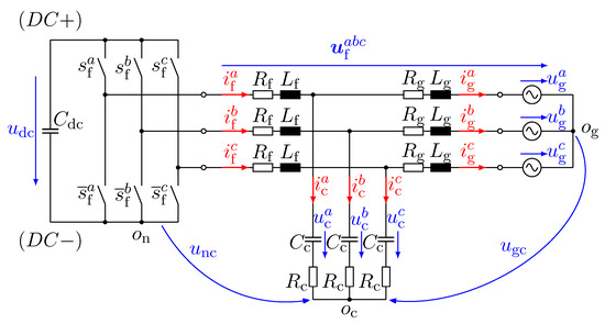 The dc-link voltage can be modeled by considering the power balance. The power (in ) supplies the dc-link and the power (in ) is fed to the LCL filter (for details, see [46]). The voltage change of the dc-link capacitor can be referred to this power flow by