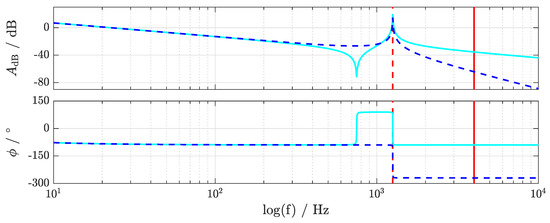 The bode plot of the LCL filter dynamics in the rotating -reference frame is shown in Figure 2 for both system inputs, and , respectively. Two different system behaviors are obtained, which depend on the chosen system output (either , or , ). The transfer functions are given as follows [43]