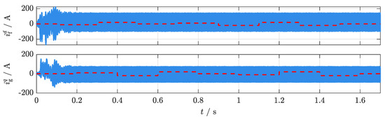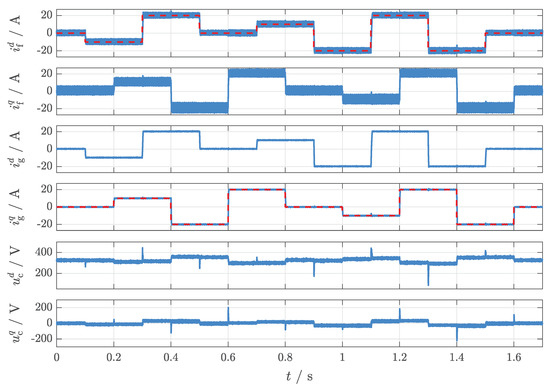 Figure 4 shows the simulation results of the discrete-time implementation of the current controller. The used solver was ode4 with a fixed time-step of . It can be seen that all system states are stable during the whole simulation. The controller has a good performance and follows the reference steps of within 2 .