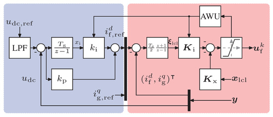 Figure 5 shows the overall and cascaded controller structure. The current state-feedback controller is highlighted in red; the dc-link voltage PI controller is highlighted in blue.