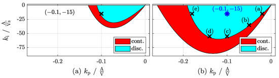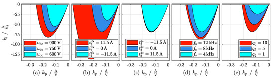 Table 4 shows all of the investigated operating points (OPs), which span over the whole operating range of the considered system. OP1 is defined as reference point. Figure 6 illustrates the impact of (a) , (b) , (c) , (d) , (e) on the stabilizing PI controller parameters (in ) and (in ). It can be seen that the filter current has the greatest impact on the stability region (see Figure 6b). The smaller (or more negative) the current , the smaller the stability region. The dc-link voltage (see Figure 6a) also has a high impact. The stability region shrinks with decreasing voltage . Almost negligible is the impact of grid current on the controller parameter tuning (see Figure 6c). A variation of the sampling frequency is shown in Figure 6d. Its impact is obvious. A high sampling frequency ensures a larger stability region and allows, therefore, for a quasi-continuous controller design. The stability region decreases with decreasing sampling frequency.
