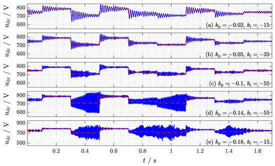 Experiment (E1):Figure 7b shows the stability region for a specific operation point (equilibrium) and gives different parameter sets for and (see points (a)–(e)). All of these points are close to the stability boundary of the discrete-time controller design. The experimental results for each of those parameter sets are shown in Figure 8. It can be seen that all control loops are close to instability, especially, if the dc-link voltage is low. This validates the stability analysis, the stability regions, and the impact of the operating point on stability. For increased absolute value of the proportional gain , the system oscillates faster around its reference value and with larger absolute value of the integral gain , the error decays usually faster. It can also be observed that the tuning in the fourth subplot (from the top) tends much more to instability than the other parameter sets. This can be explained by its tuning itself with proportional as well as integral gains that are closest to the instability boundary (see (d) in Figure 7b).