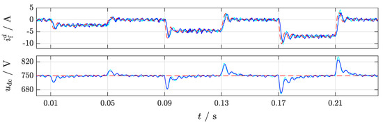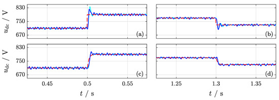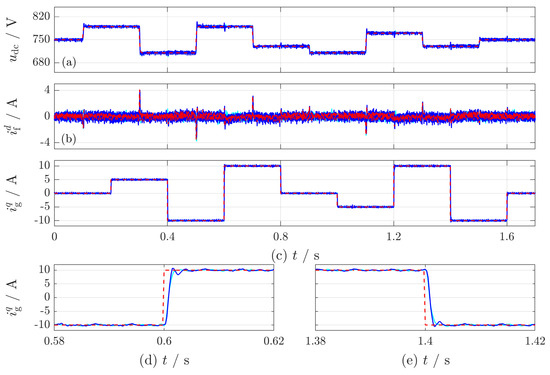 Experiment (E2): the aggressive tuning factors, which are needed because of the small dc-link capacitance, lead to a huge overshoot (≥ 40 ) due to reference steps in (see Figure 9a,b). To prevent such overshoots, a prefilter was implemented. The prefilter smooths the reference signal and damps the overshoot. The experimental results of the control loop with prefilter are shown in Figure 9c,d. Because the tracking performance of dc-link voltage controller does not influence the robustness of the control loop, the implementation of a prefilter is not critical. Figure 9 also includes the simulation results. It can be seen that the derived system model fully covers and describes the real system and test bench with high accuracy. In Figure 10, all of the controlled states are plotted. In Figure 10a,c, the good control performance of the proposed controller can be seen. Both the dc-link voltage and the grid current track their corresponding references and quickly and accurately (in steady-state). A change in the reference signal leads to a change of the reference filter d-current in the cascaded current control loop (see Figure 10b). Moreover, the dc-link voltage control loop and the grid current control loop hardly affect each other (almost no cross-coupling is visible). Only large reference steps of 20 at and have an impact on the dc-link voltage control loop. The current control loop for the grid q-current allows for indirectly controlling the reactive power. It is almost completely decoupled from both the dc-link voltage controller and the current controller of . This can be observed in Figure 10c: smoothly follows its reference without overshooting (as plotted in detail for two reference jumps in Figure 10d,e). Additionally, the simulated signals match the experimental signals almost perfectly.