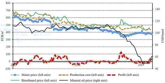 The major cost item of the corn-based ethanol production is the raw material, which reached up to 59%, based on the 13-year Iowa State time period []. Excluding depreciation, this share went up to 85–95%, which proves that depreciation is the second largest cost item in the ethanol industry, due to the high initial investment need. Changes in the price ratio of maize and ethanol are subject to significant uncertainty, and this fundamentally determines the profitability of ethanol production (Figure 1).