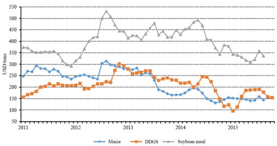 Evolution of maize, distiller’s dried grain with solubles (DDGS), and soybean meal prices. Source: [].
