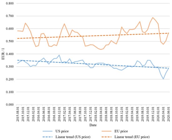 Ethanol prices differ remarkably in the EU and in the US, as different raw materials and technologies are used. Regarding the EU, the average price in the last 5 years was USD 0.54/L and showed a slight increase during the analyzed period. Meanwhile, in the US, the average price was only USD 0.32/L and showed a decreasing trend (Figure 3). The average price difference is 40% (between 22% and 66%), which influences their competitiveness on the regional ethanol markets. Another important trend is the widening price gap between these two regional markets.