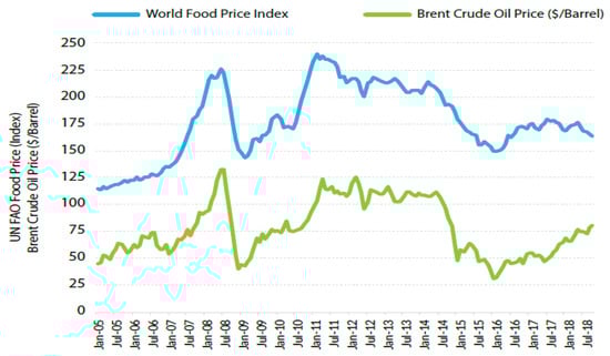 Changes in oil prices showed a high correlation with food prices up until 2017, while they moved in the opposite direction in 2017 and 2018 (Figure 4). Alghalith (2010) [] found that the increase of the oil price by UD 1 resulted in a 5.6-point-higher food price index on average.