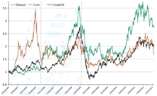 Trujillo-Barrera et al. (2012) [] found a weaker connection between oil and maize prices than between maize and ethanol prices in the US. Natanelov et al. (2013) [] pointed out that the latter was also strengthened by the US governmental fuel policy in the analyzed 2006–2011 period. The variability of the maize prices was greater than that of the ethanol or crude oil prices (Figure 5). This was caused by the significant maize demand of the ethanol industry and the relatively high oil prices, which made ethanol production competitive.