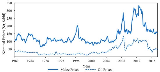 Connection between maize and oil prices, 1980–2017. Source: [].