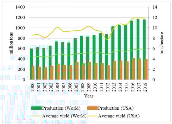 The expected maize production area in 2020 will be 196 million hectares globally with 5.9–6.0 tons/ha average yield, which will result in 1170 million tons of production []. The US has a key role in global production. Its global share of more than one-third demonstrates this, with a yield double that of the world average (Figure 7).