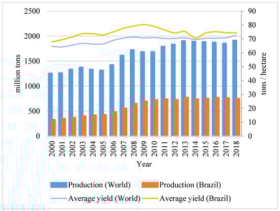 World and Brazilian sugarcane production and yield, 2000–2018. Source: [,].