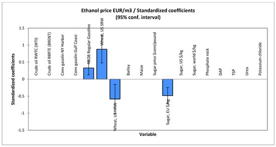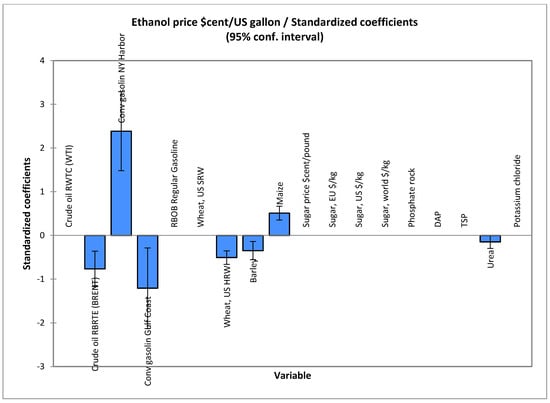 The US ethanol prices indicate a significant positive correlation with gasoline and US sugar prices, while they negatively correlated with wheat prices. Regarding artificial fertilizers, phosphate rock (r = 0.40) and urea, (r = −0.34) showed a positive correlation with ethanol prices. These results correspond with the findings of Dong (2019) [] and Trujillo-Barrera et al. (2012) [] regarding maize and ethanol interactions (Table 3).