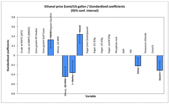 Regarding the US ethanol prices, the factor-based results are similar to the previous, variable-based model. Fuel, raw materials, and maize prices became part of the influencing factors, corresponding with the results found by Elleby et al. (2020) []. The significance of the so-called COVID impact was also strengthened, as that variable affected the US ethanol prices. The factor-based model contained only raw materials and COVID as significant factors (Figure 12).