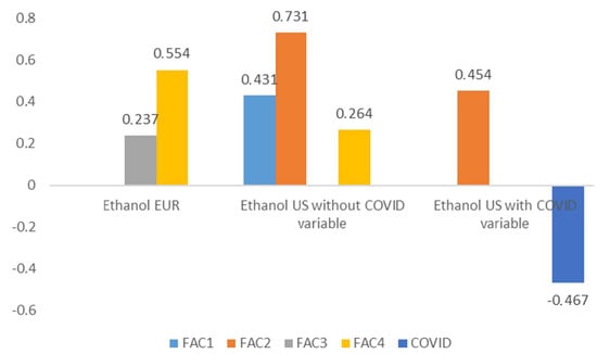 Our factor analysis showed that the prices of sugar, maize, and competing final products (oil) influenced the ethanol prices in the US. These influencing factors were the prices of key raw materials and their inputs (corn, fertilizer) in the EU. COVID-19 did not change this in the EU, but in the US, the virus clearly excluded oil and maize from the price determinants of ethanol. Ethanol prices are expected to be greatly influenced by the spread of new generations of biofuels and the market of their feedstocks in the future.