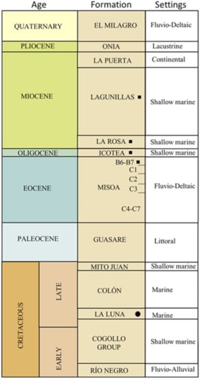The stratigraphic column of both study areas comprises Cretaceous and Tertiary sedimentary rocks (Figure 2) and presents the following lithologies, ordered from bottom to top: the arkosic sands of the Río Negro Formation; Apón (shales/gray limestones) unit; Lisure (sandstones interbedded with shales and limestones rich in glauconite); the Cogollo Group consisting of the Maraca (limestones rich in fossil debris); La Luna (marlstones and black limestones); Colón (dark shales); Mito Juan (siltstones); Guasare (sandstones and limestones); Misoa (sandstones, lutites, limonites, and limestones); Icotea (limonites, sandstones, and claystones); La Rosa (sandstones interbedded with fossiliferous shales); Lagunillas (shales, coals, sandstones, and claystones); La Puerta (sandstones, claystones, and shales); Onia (siltstones, sandstones, claystones), and; lastly, El Milagro (conglomerates and sandstones) [,].