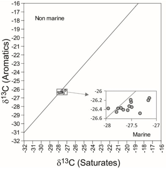 The carbon isotope values of the aromatic and saturated fractions of sampled oils are similar among them (see Table 1), with standard deviations approaching the analytical error (0.5‰), thereby suggesting that all sampled oils were derived from the same source rocks []. When considering the Sofer diagram ([], Figure 3), the δ13C values for the oils analyzed plot in the marine organic matter region, which is consistent with these samples being sourced from the marine organic materials of the La Luna rock unit, in line with previous studies indicating that the La Luna rock unit is the primary source rock of the region [,]. Nevertheless, these data must be interpreted cautiously as several secondary processes can alter the carbon isotopic signature [].