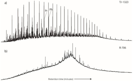 Total ion chromatogram of the saturated fraction of TJ-1323 (a) and R-706 (b) oils.