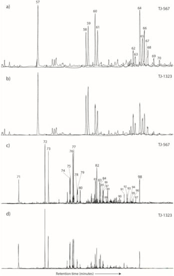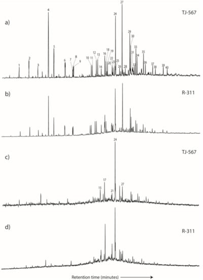 Examples of m/z 191 (a,b) and m/z 177 (c,d) ion chromatograms of the saturated fraction of representative TJ-567 and R-311 oils.