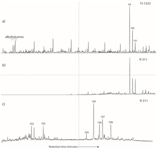 The m/z 105 + 198 ion chromatograms of the aromatic fraction for TJ-1323 (a) and R-311 (b) oils showing methyldibenzothiophene and alkyltoluene distributions; (c) representative m/z 231 ion fragmentogram of the aromatic fraction of the R-311 oil showing the triaromatic steroidal hydrocarbon distribution.