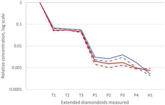 QEDA fingerprints corresponding to TJ-1323 (in red color) and R-706 (in blue color) oils (indicated by continuous lines), and respective hydrous pyrolysates originating from asphaltenic fraction (dash lines). Note: quantities of higher diamondoids are relative to that of triamantane, which is set at one [].