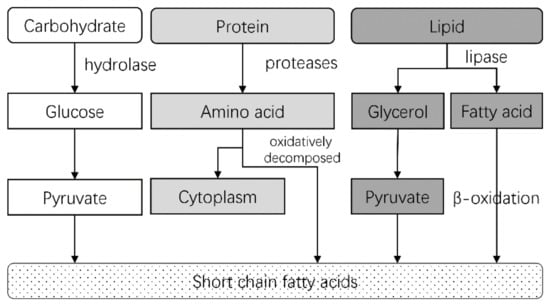 Carbohydrates, proteins, and lipids are the main organic substances in FW. They are first hydrolyzed to soluble micromolecular substances, such as glucose, polypeptides, long-chain fatty acids, and glycerinum, and are then degraded to organic acids or alcohols [], as shown in Figure 1. Specifically, carbohydrate is first converted into disaccharide outside the cell, and disaccharide is converted into monosaccharide outside or inside the cell. Within the cell, monosaccharide is converted into pyruvate, which eventually generates various acids, alcohols, ketone, etc. []. Protein is gradually decomposed into amino acids under the catalytic action of proteases at the extracellular hydrolysis stage []. Some amino acids are used for the synthesis of cellular substances, while others are oxidatively decomposed to VFAs through deamination and decarboxylation [,]. The process of lipid degradation depends on lipase. Lipase, diglyceride lipase, and monoglyceride lipase gradually hydrolyze lipid into glycerol and fatty acids. The glycerol can be catalyzed to form pyruvate []. Long-chain fatty acids continuously remove the acetic acid of two carbons from the long carbon chain through β-oxidation; short-chain fatty acids undergo β-oxidation to form acetic acid (even-numbered carbon chain), propionic acid (odd-numbered carbon chain), H2, etc. [,,]. In the fermentation system with mixed inoculation, some microorganisms can secrete extracellular hydrolase to achieve the hydrolysis of FW. However, in pure culture, extra hydrolase is required in the first step of FW fermentation.