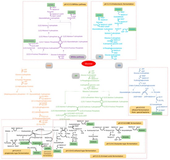 At different pHs, different fermentation types and metabolites occurred due to the alternation of microbes and enzymes. Feng, et al. [] reported that homolactic fermentation through the EMP pathway dominated at pH 3.2, heterolactic fermentation through the PK pathway and the Bifidus pathway occurred when pH increased to 4.5, microorganisms produced butyric acid and acetic acid through the EMP pathway at pH 4.7–5.0, and mixed acid fermentation through the EMP pathway occurred at pH 6.0. Wu, et al. [] found homofermentation and heterofermentation coexisted in the start-up period at pH 4.0, heterofermentation dominated the stable period at pH 4.0, and the Bifidus pathway played an important role in addition to heterofermentation at pH 5.0. The general relationship between pH and metabolic pathway is shown in Figure 2.
