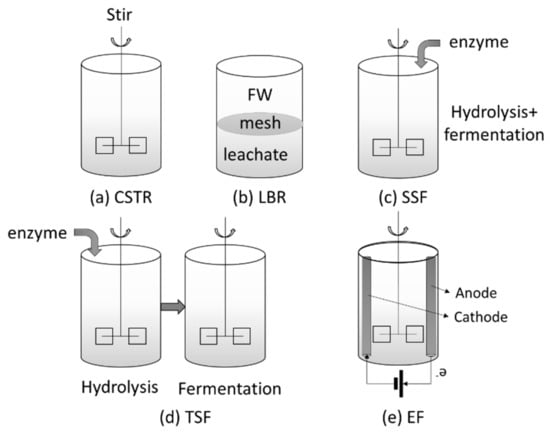 Reactors play a key role in FW fermentation, and their configuration affects bioreaction efficiency and determines the feasibility from laboratories to industrial application. In the literature [,,,], the commonly used fermentation reactors include continuously stirred tank reactors (CSTR) and Leach bed reactors (LBR), and the possible processes include single-stage fermentation (SSF), two-stage fermentation (TSF), and electro-fermentation (EF), as shown in Figure 3.