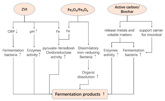 Some additives can be used to enhance FW fermentation (Figure 4). The most used additives are iron-based materials and carbon-based materials. The former includes zero-valent iron (ZVI), iron oxide, and magnetite (including their Nano forms), and the latter mainly includes activated carbon and biochar.